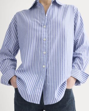 Leveling-up any look. it combines classic shirting details—collar. button placket. and sleeve cuff. with a modern shirttail hem. gentle cocoon shape. in an oversized fit. Made with our silky better-for-you Supima® cotton. it feels good on and looks even better. Roll up the sleeves. play with how you tuck it. dress up with tailoring or down with baggy jeans. it makes it all look effortless.