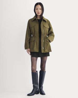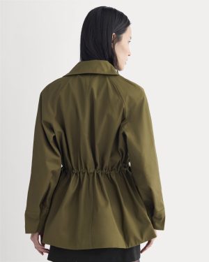 This utilitarian-style field jacket has practical features built-in—including a full zip with snap placket and internal hidden drawstring for adjustable waist definition. Hitting at mid thigh. it has four patch pockets with flaps and hidden snaps. plus snap-adjustable cuffs. Made with 100% certified organic cotton. it has a PFAs-free water resistant and repellent finish. Here to do all the heavy-lifting. wear it with jeans for utilitarian vibes or dress up with a wide-leg trouser.