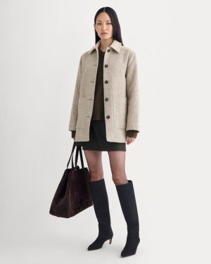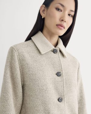 Features a contrast collar and front patch pockets. Heavyweight. herringbone design made from a recycled wool blend—produced in Italy at Manifattura Emmetex—and textured boucle yarn for a warm and wooly handfeel. Better and bellisima.
