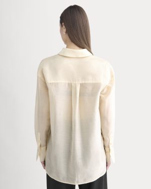 We took a classic oversized shirt with all the signature moves—collar. button placket. cuffs. and shirttail hem. and gave it a fresh perspective in sheer organza. Made with our better-for-you blend of OCS-certified organic cotton and silk. it has just the right amount of lightness with a little structure. Your new go-to luxe layer. style it over a cami or bra top. with tailored trousers. curve jeans. or a slip dress.