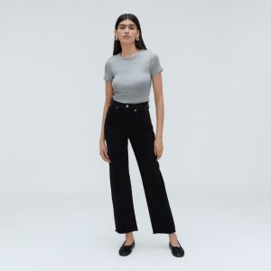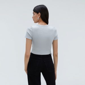 The ’90s Rib Tee features a scallop-weave neckline and sleeve detailing in a playfully cropped silhouette. Revealing just a hint of midriff. its textured fine-rib fabric—made of organic cotton with a touch of elastane. gives it that figure-skimming fit. Pairing well with your favorite high-waist jeans or pants for that perfect on-camera moment.