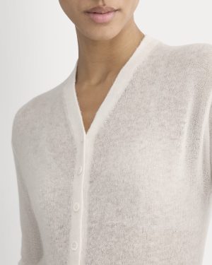 Featuring a high V-neckline. it has gently dropped shoulders. a relaxed fit. and front button placket. Made with a semi-sheer ultra airy Alpaca and extra-fine merino wool blend yarn. it’s perfect for layering over a bralette or cami for dressier occasions or a tee and denim for downtime.