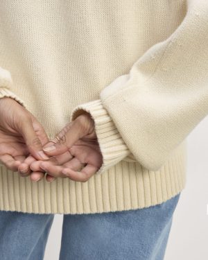 This piece features a classic polo neck. a boxy. relaxed fit. and wide straight sleeves with a chunky rib hem.