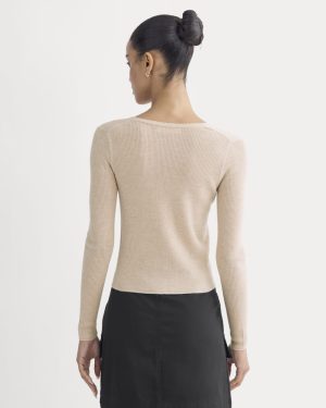 This piece features a V-neck. button placket. long sleeves. cropped. fitted silhouette. in a lightweight ribbed RWS-certified ultrafine merino wool.