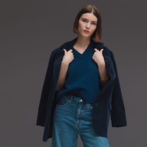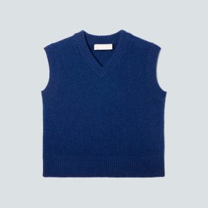 This season’s most popular layer. The Cashmere Vest features a classic ribbed V-neck and ribbed sleeves for a vintage-inspired look. With a slightly shrunken fit. it can be styled alone or worn over shirts and tees on cooler days. Soft. Luxurious. Warm. All the beauty of cashmere—with over 90% less raw material carbon emissions.