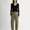 Our Chino in Buttersoft is a high-waisted pant crafted in a buttery soft. 100% TENCEL™ Lyocell fabric. It features a cool curved leg (similar to the Utility Barrel Pant) and asymmetrical back pockets: one with a button-back flap pocket and one with a slip pocket. These pants are slouchy. so if you want a slimmer fit. try sizing down.