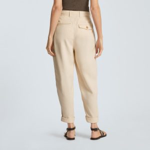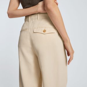 Our Chino in Buttersoft is a high-waisted pant crafted in a buttery soft. 100% TENCEL™ Lyocell fabric. It features a cool curved leg (similar to the Utility Barrel Pant) and asymmetrical back pockets: one with a button-back flap pocket and one with a slip pocket. These pants are slouchy. so if you want a slimmer fit. try sizing down.