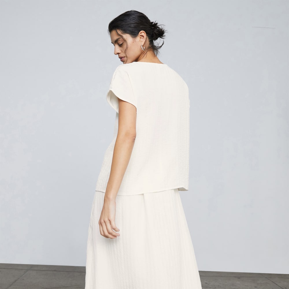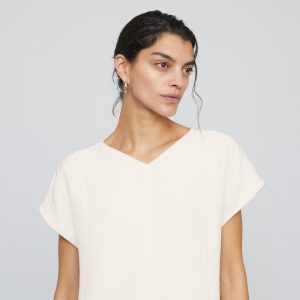 Featuring a high V-neck and cap sleeves in our new. softer. textured stripe viscose fabric. This classic style will get heavy closet rotation. This fabric has a heavier weight and is great for transitioning seasons. The viscose in this garment comes from an FSC-certified supplier who has been audited and assessed as being at low risk. or has taken substantive action to eliminate known risk of sourcing rayon and viscose from ancient and endangered forests by CanopyStyle. Made from post-consumer plastic bottles that are collected. washed. chopped. melted. and then made into polyester yarn. REPREVE® recycled polyester boasts less energy and water usage as well as reduced greenhouse gas emissions. when compared to virgin polyester and other conventional recycled plastic sources. The REPREVE® registration platform provides full supply chain visibility from source to product—ensuring the exact bottle count per product and source location of those bottles. To date. REPREVE® has saved over 30 billion plastic bottles from landfill.