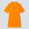 This piece features a relaxed oversized fit. midi length. front placket with hidden button closure. stand collar. side seam pockets and two patch chest pockets.