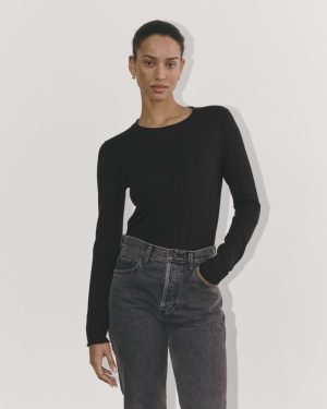 A slim fit. rib trim crew neck. it features a rolled edge on the sleeves and neck. Made with a lightweight. soft organic cotton and certified recycled cashmere blend. it’s designed for year-round wear. Style it with jeans. pants. under a cardie. or blazer. it’s that easy.