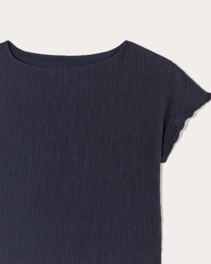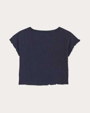 Add this dreamy new tee to sweeten up your look. Featuring a boat neck. relaxed. cropped fit that hits at the hip. short. dolman sleeves for a dramatic drape. and a lettuce-edged hem. made in our newest crinkled knit fabric. Bonus Points: Get the matching pants to create your new favorite party set—the answer to your what will I wear woes.