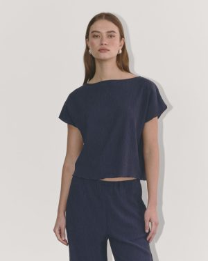 Add this dreamy new tee to sweeten up your look. Featuring a boat neck. relaxed. cropped fit that hits at the hip. short. dolman sleeves for a dramatic drape. and a lettuce-edged hem. made in our newest crinkled knit fabric. Bonus Points: Get the matching pants to create your new favorite party set—the answer to your what will I wear woes.