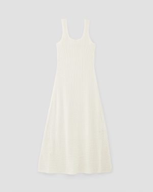 This piece features a slim fit body with an A-line skirt. midi length. open eyelet stitching. and a scoop neck.