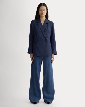 Taking those oh-so cool-girl relaxed vibes of the Japanese GoWeave Drapey Blazer and remixing it in FSC-certified triacetate. this blazer is the ultimate throw-on-and-go topper. It features a double-breasted silhouette with notch collar and lapels. softly tailored shoulders—with internal shoulder pads. and front welt pockets. Pair it with the Triacetate Way-High® Drape Pant for a head-to-toe party look. The Forest Stewardship Council (FSC) certification ensures that products come from responsibly managed forests. The standards expand the protection of water quality. prohibit harvest of rare old-growth forests. ban highly hazardous chemicals. and require forest managers to engage local community members as well as protect customary rights of indigenous people.