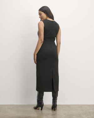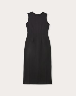 This piece features a slim fit. sleeveless silhouette. crew neckline. back zipper at the neck. midi-length with a tall back slit for easy movement. in our soft. double-knit Dream fabric with a hint of stretch.
