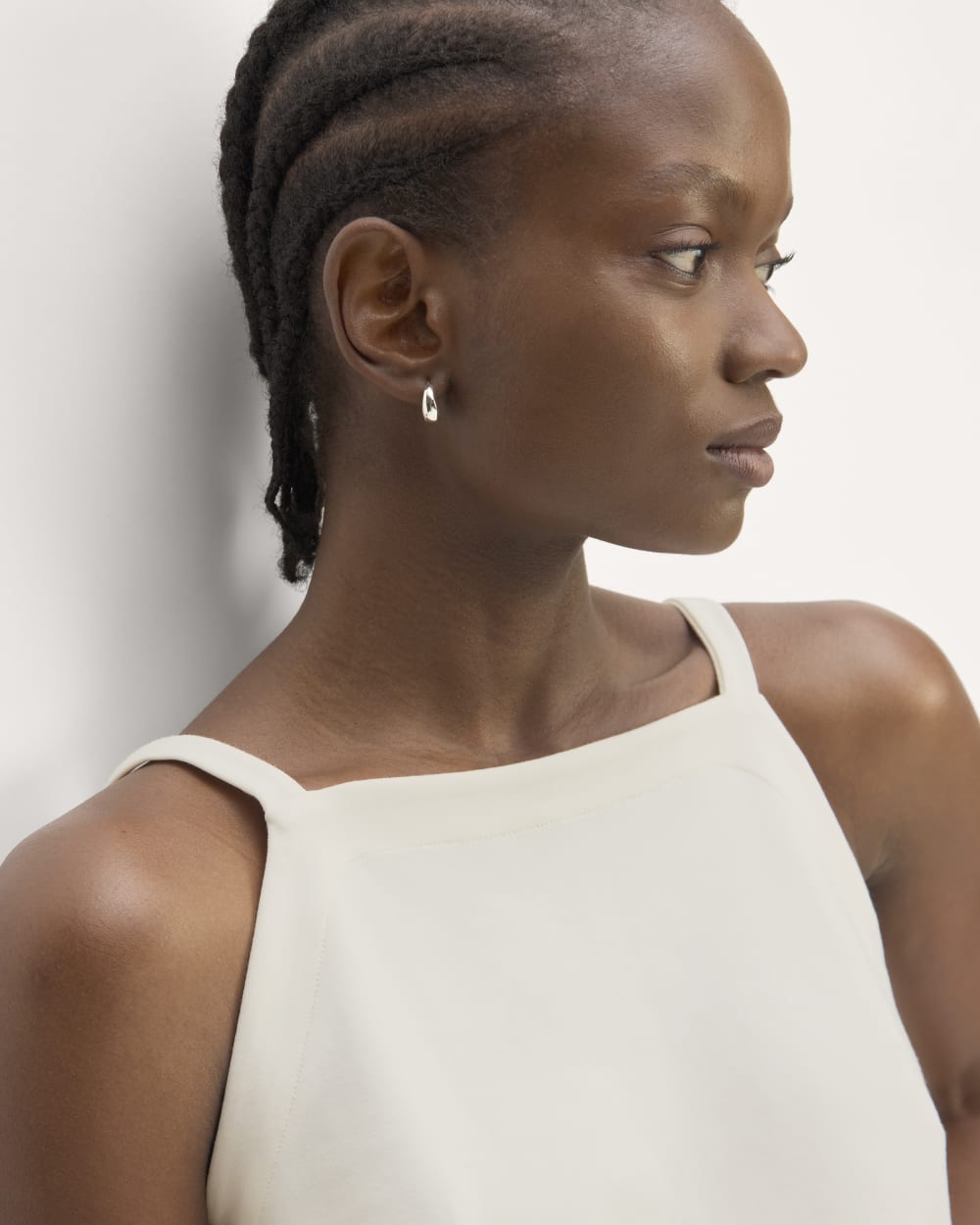 This piece features a high neck. sleeveless. and cropped length. with waist and bust darts. made with our dream organic cotton and TENCEL™ Modal blend.
