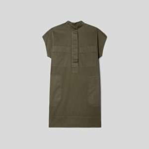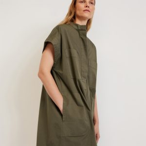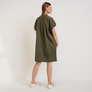 Featuring patch and on-seam pockets. center front placket with hidden button closure. stand collar. and slits at the hem. The best part? It’s made with 98% organic cotton. This dress is designed to be oversized. For a smaller fit. we recommend sizing down. Organic cotton uses crop rotation. cover crops. and organic fertilizers instead of toxic chemical fertilizers or pesticides—which means cleaner water. lower water usage. lower pesticide use. healthier soil. and a safer working environment for cotton farmers. compared to conventional cotton.