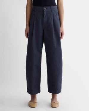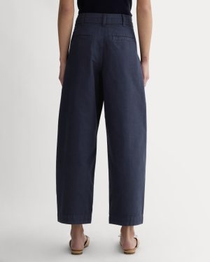 This piece features a high rise. ankle length. barrel leg. with front angled pockets. back welt pockets. front and back darts for shape. zip fly. in organic cotton with a touch of linen.
