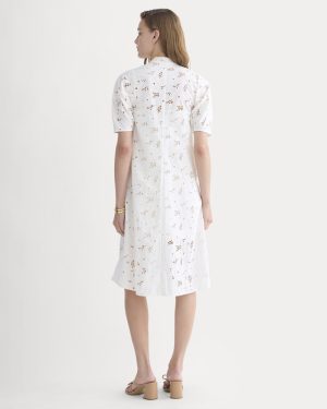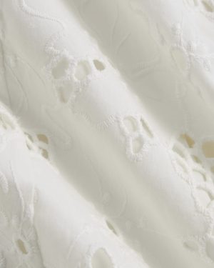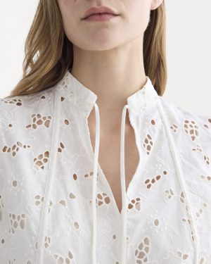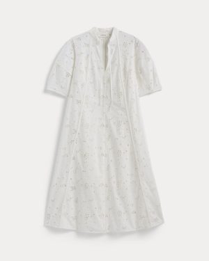 Featuring a midi length. an easy A-line silhouette. it has a stand collar. V-neckline with tie neck detail. Lantern short sleeves and elevated eyelet organic cotton gives it a fashionable edge. Wear with slingbacks. sandals. or mules.