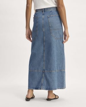 This piece features a high rise. no stretch. A-line silhouette. and maxi length.
