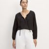 This piece is made from FSC-certified viscose and features a relaxed fit. short. capped sleeves. button closure at back neck. and a classic crew neckline with shirring detail.