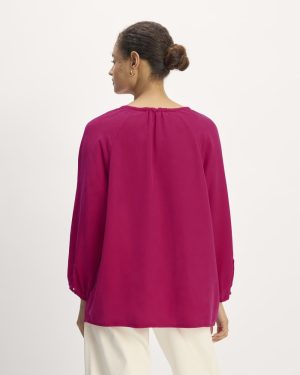 This piece features a fluid fit with a gathered. adjustable neck. long raglan sleeves. a gathered sleeve cuff with button closure. and a buttoned front placket. and made from 100% TENCEL™ Lyocell.