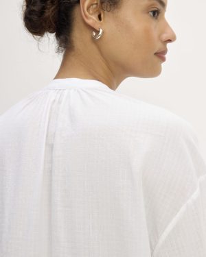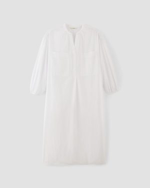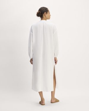 This sheer piece features an oversized. caftan fit with dual sizing. maxi length. long sleeves with binding and button closure at cuffs. oversized double-patch pockets. knife pleat in front. and side seam slits.