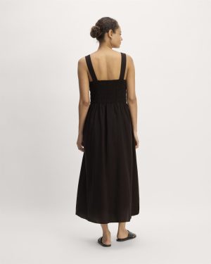 This piece features a smocked bodice. square neckline. fit-and-flare silhouette. midi length. bra-friendly straps. on seam side pockets. full lining. in an airy organic cotton.