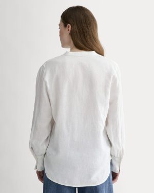 This piece features a band collar. front button placket. shirt tail hem. relaxed silhouette. and gathering at sleeve cuffs. in European Flax™ certified linen.