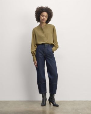 This piece features a relaxed fit. crewneck with button placket. and long sleeves with button-cuffs. in our eco-conscious Washable Silk. for more beauty and less waste.