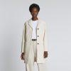 This piece features a relaxed fit. double breasted. half lined. button closure. and front welt pockets. in linen.