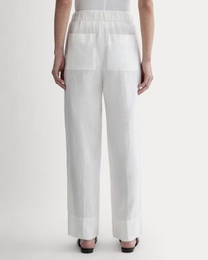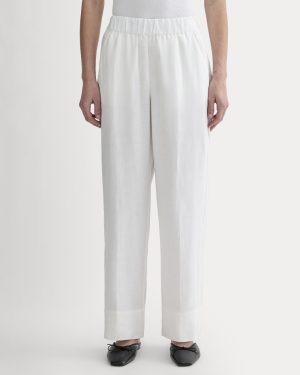 This piece features a mid rise. straight fit. regular length. and pull-on waistband. made with 100% linen.