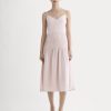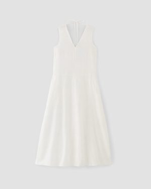 This piece features a relaxed. maxi length. sleeveless fit with a dropped waistline. v-neck in front and back with a tie detail in back. on-seam side pockets. invisible side zipper. and full lining.
