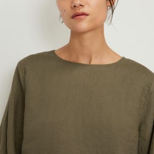 The Linen Long-Sleeve Top features a classic crew neck. a center back invisible zipper. slight balloon shape sleeves. a relaxed body fit. and the front body is lined in cotton so you can’t see through the fabric. Made from flax. which generally creates less waste from production. linen has high resilience with a reduced carbon impact compared to cotton—using lower amounts of water. pesticides. and chemical inputs.