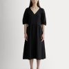 This piece features a relaxed fit. slightly waisted midi length. with a V-neck in front and back. front and back seaming details. on seam pockets. and made from 100% European Flax™ Linen.