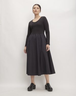 Made from a stretchy Supima® cotton jersey. The Riviera Dress features a comfortable long-sleeve knit top with a rounded scoop neck and a voluminous woven bottom. The top portion is made from our ultra-soft and durable Supima® cotton. while the skirt is made with 100% cotton for all-day breathability. The pinnacle of versatility. Did we mention it has pockets? Grown in the United States. Supima® cotton is distinguished by its extra-long fiber length. which gives it more durability and a softer hand feel. Supima® is able to authenticate the source of its cotton across the entire supply chain. from the fiber and yarn to the fabric and finished product.
