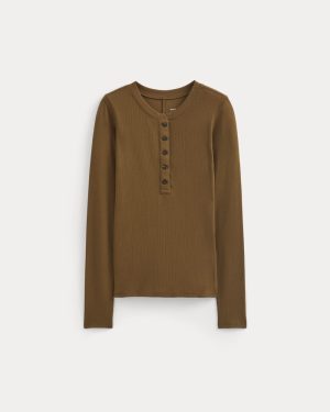 This long-sleeve. slim fit henley features a crew neckline with a curved trim and front button placket. Made with ribbed Supima® cotton. Wear under a blazer with relaxed pants. tuck into high-rise denim. or throw on with your favorite skirt.