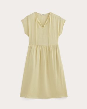 Designed in an airy textured fabric with a beautiful drape. this relaxed silhouette features a babydoll-inspired waist. keyhole neckline. midi length. and short wide sleeves.