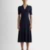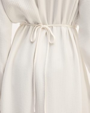 This piece features a midi length. button closure. collar. gathered waist with adjustable back-tie for a relaxed or waisted fit. full-length sleeves with cuffs. and on-seam side pockets. in FSC-certified viscose and recycled polyester.