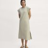 This piece features a midi length. button closure. collar. gathered waist with adjustable back-tie for a relaxed or waisted fit. full-length sleeves with cuffs. and on-seam side pockets. in FSC-certified viscose and recycled polyester.