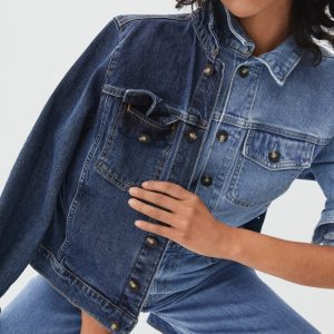 The Modern Jean Jacket features a point collar and a classic button front. piped patch pockets. contrast topstitching. handy side pockets. and a snug fit. The best part? It’s made of our cleanest denim fabric yet.**This jacket is made of organic cotton and Roica® V550 yarn—i.e.. the first stretch yarn worldwide that isn’t made with harmful chemicals. This innovative fabric. along with the use of microplastic-free dyes and recycled trim. has allowed us to be one of the first companies to make denim that doesn’t dirty the planet.