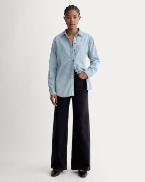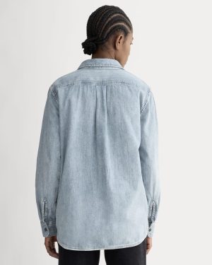 This piece features an oversized fit. shirt collar. front button closure and cuffs. long sleeves. and shirttail hem in our lightweight denim. Consider it a wardrobe essential.