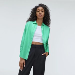Made from high-twist. 100% cotton yarn in a traditional twill weave. this drapey shirt has an extra-smooth feel you usually get from decades of wear—in a roomy. slightly oversized fit that’s easy to dress up with heels. or dress down with jeans. It’s that perfect button-down you can never find. found.Fun fact: We’re moving all of our cotton to organic. As we make the transition from conventional cotton to organic. you’ll see a mix of inventory on the site. To learn more about our organic cotton commitment. check out our