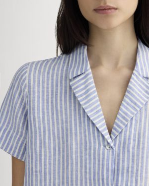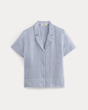 This piece features a relaxed fit. short sleeve. notch collar. and button closure. in linen.