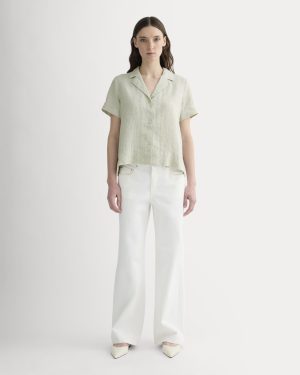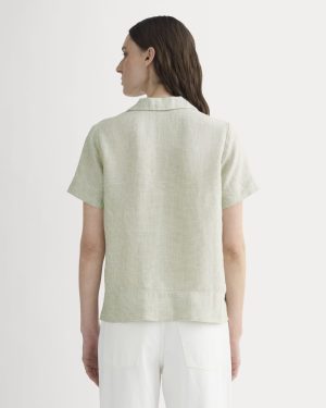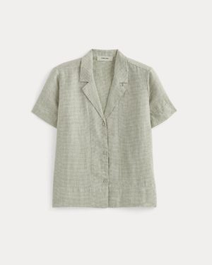 This piece features a relaxed fit. short sleeve. notch collar. and button closure. in linen.