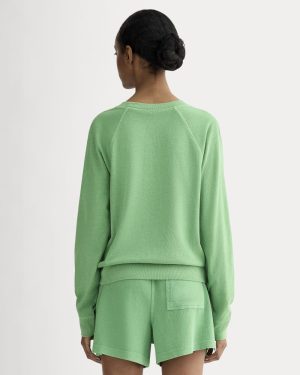 This piece features a relaxed fit. crew neckline. long. raglan sleeves. in premium weight 100% organic cotton jersey.