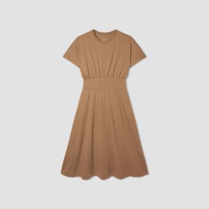 Made with certified organic cotton jersey. The Organic Cotton Waisted Dress. features a classic crew neck with a slouchy bodice. a banded-and-cinched waist with a full skirt and midi length. This one-and-done dress can be worn casually with sneakers or with heeled sandals for a more elevated look.