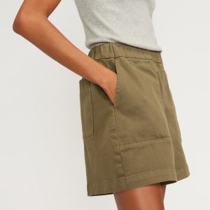Your new summer love. The Organic Pull-On Short features a high-waist. A-line silhouette. with easy-on elasticated tie-waist. Slanted front pockets with stitching details and back patch pockets complete the look. Served up in your favorite organic cotton twill fabric with a touch of elastane for some stretch. these shorts keep you cool and comfy all season round. Organic cotton uses crop rotation. cover crops. and organic fertilizers instead of toxic chemical fertilizers or pesticides—which means cleaner water. lower water usage. lower pesticide use. healthier soil. and a safer working environment for cotton farmers. compared to conventional cotton.