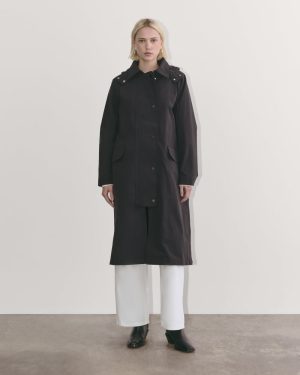 This piece features a spacious hood. a zippered front. easy snap closures. front flap pockets long-length silhouette. and water-resistant.