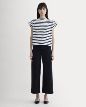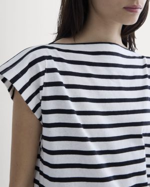 This oversized muscle style features a wide boat neckline and a boxy fit. Front and back dart seams create a subtle sculpted shape. Easy and versatile to style with everything. try barrel jeans. pleated shorts. or a column skirt to reflect those clean lines.